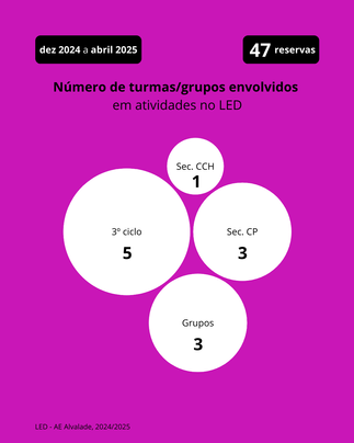Numa primeira análise dos registos que temos desde dezembro, quando o LED do AE de Alvalade entrou em funcionamento, já foram feitas 47 reservas deste espaço, das quais 45 foram para a realização de atividades com alunos.